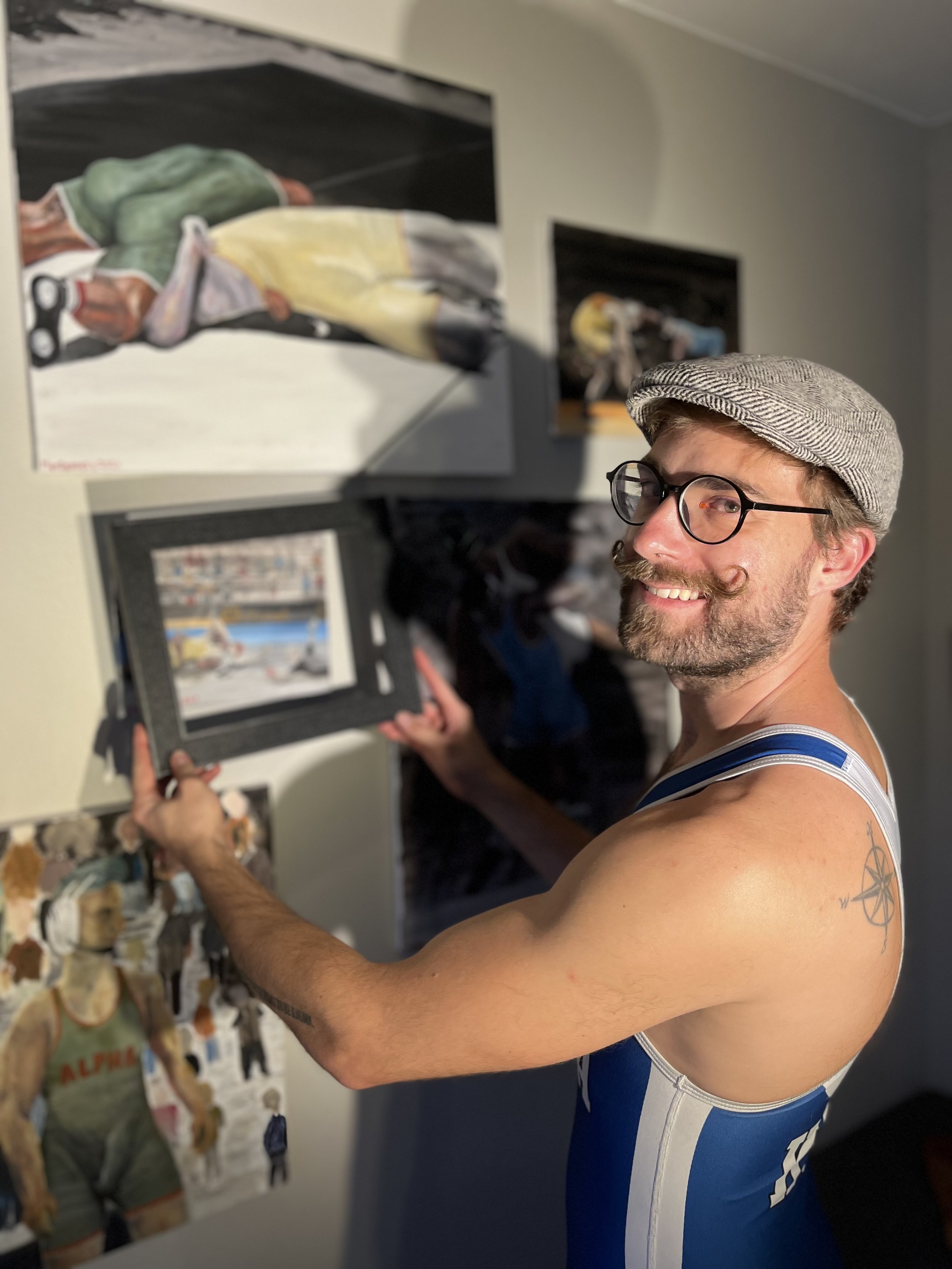 Montgomery’s experiences as a competitive freestyle and folkstyle wrestler have also shown up in his work. Most notable is his 10-piece collection titled “Boys of the Alpha League” where he paints varied wrestling sequences as viewed through the lens of a queer man. He has clear intensions of investigating the male form further, as well as delving deeper into the world of kink art.
